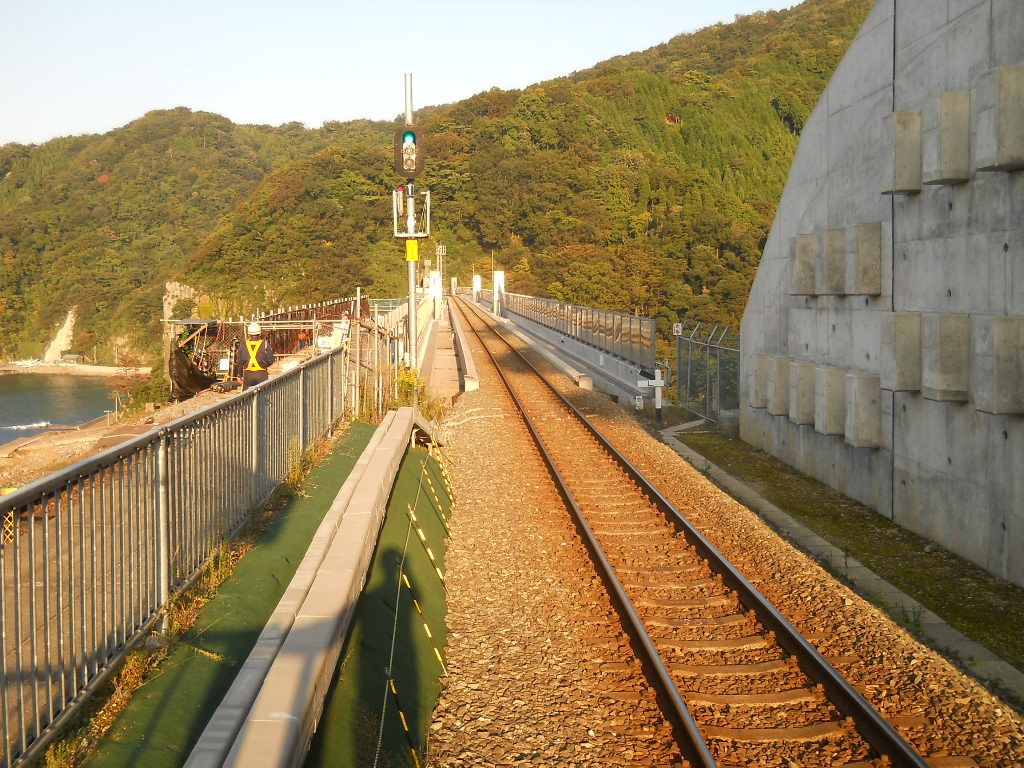 餘部駅のホームから鎧駅の方向を見た写真です。信号の先はかの余部の橋。