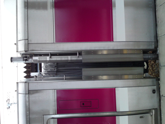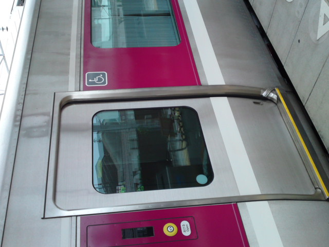 その奥の乗客用ドアは身障者用に幅広使用になっているうえ、全ドア共通で足元に黄色いラインが入っています。