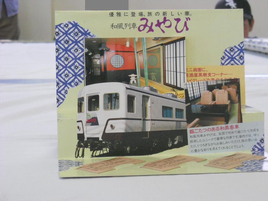 そのレイアウトの真ん中に飾ってあったジョイフルトレイン「みやび」のボード。記念の切符もおいてあります。