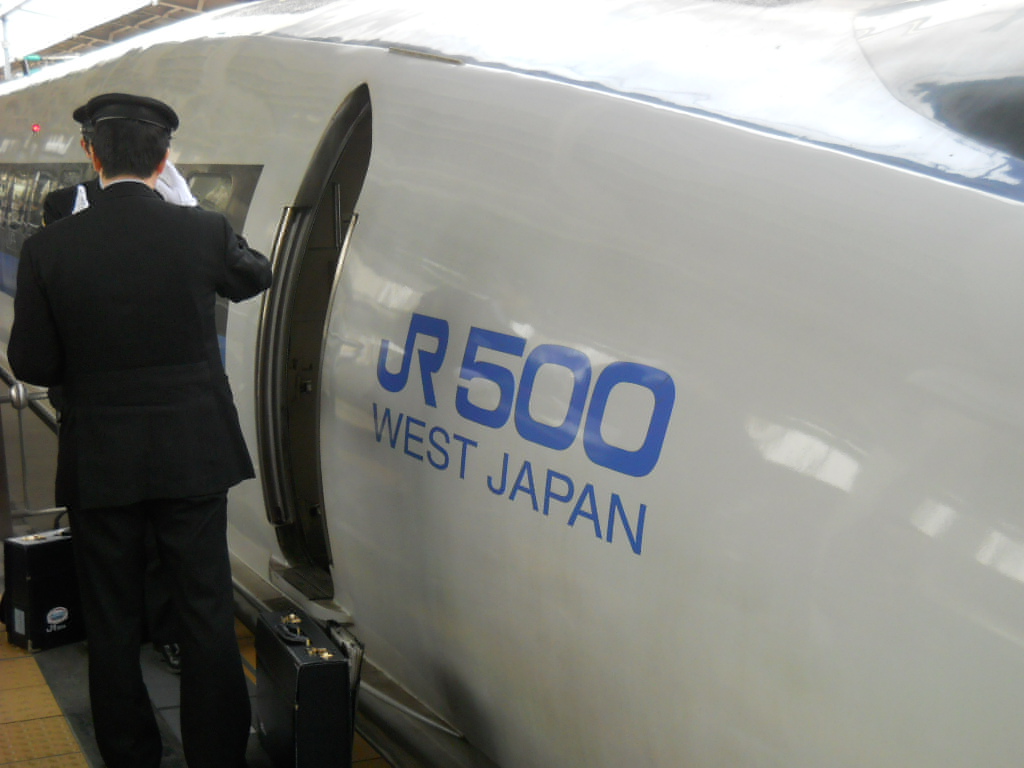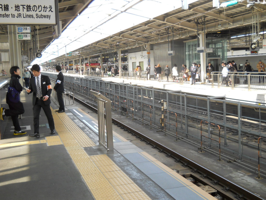 振り向いて「のぞみ11号」の発車を見送ります。