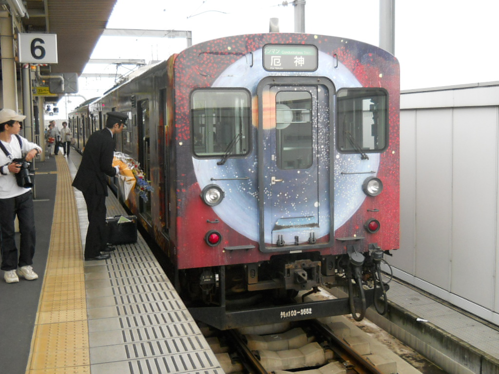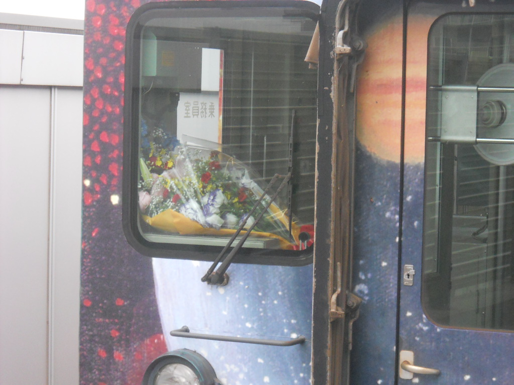 ちょうど花束を持った運転士さんが乗り込むところを撮ったみたいで。折り返し乗務なんですね。