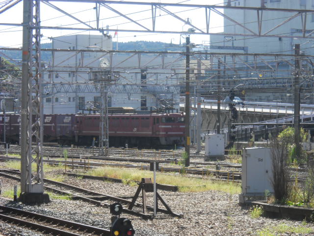 遠目に通過していくEF81の下り貨物列車。