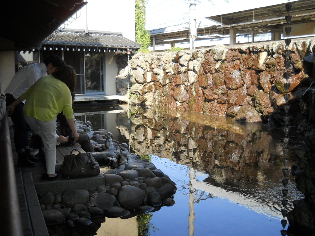 駅前の旅館でしょうか? そこにあった足湯と石垣です。